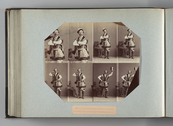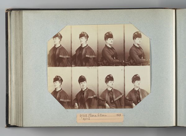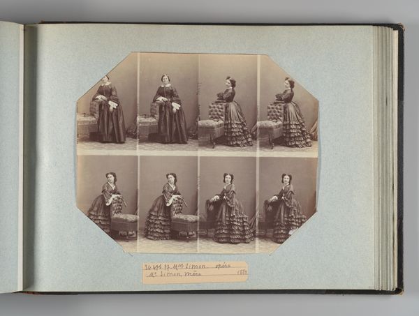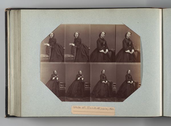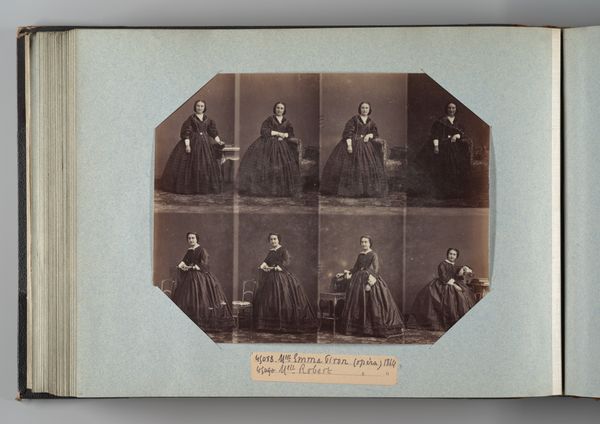 André-Adolphe-Eugène Disdéri made this photographic print in the 19th century, mounted on an album page. This is an example of a "carte de visite," a calling card format that Disdéri patented. The material is albumen print, made using a process involving paper coated with egg white to increase its sensitivity to light. This process resulted in a sharp image with a wide tonal range. Each of the six photographs required time and labor to produce, from preparing the photographic plates to developing the image and mounting it. The card format speaks to the rise of mass production and consumption in the 19th century. Photography was becoming more accessible, but still required technical expertise. The subject, in her elaborate dress, conveys status and wealth, reflecting the aspirations of a rising middle class. Disdéri's innovative approach made photography into an industry, demonstrating the intersection of art, commerce, and social identity.