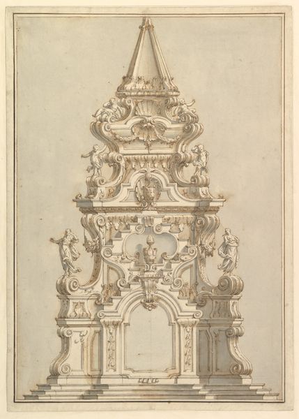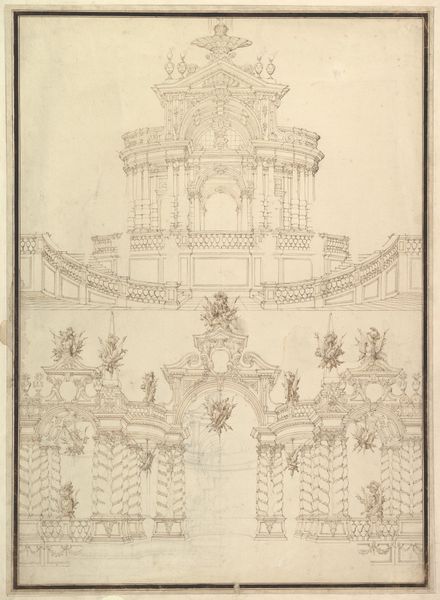 Editor: Here we have Giuseppe Galli Bibiena's "Elevation of a Catafalque," created sometime between 1696 and 1756, using pencil, ink, etching, and engraving. The architectural structure has this ghostly presence created by the fine lines, almost like it might disappear at any moment. What aspects of its construction or style stand out to you? Curator: The beauty of this piece lies in its line, depth, and volume, achieved with etching and engraving. Notice how Bibiena employs hatching and cross-hatching to generate tonal gradations that convey depth. Observe the interplay between linear precision and atmospheric evocation, particularly in defining the curvature of the dome and the massing of the columns. The very precision lends it its 'ghostly presence' by emphasizing shape without color. Do you observe how the shapes overlap? Editor: Yes, the way the columns and arches intersect creates a sense of enormous scale, even in this two-dimensional work. Is this layering something Baroque artists commonly explored? Curator: Baroque art indeed pursued dynamism and theatricality. In "Elevation of a Catafalque," however, observe how linear clarity reigns supreme despite the implied spatial complexity. We are not presented with overt emotionalism through gestural brushwork, but with carefully wrought lines that build up a formidable architectural space. Editor: So, its Baroque qualities aren’t about overt drama, but rather about spatial and structural ingenuity conveyed with restrained lines. I'll need to remember that. Curator: Precisely. By eschewing bold painterly effects for linear sophistication, the work emphasizes the architectural design's inherent logic and aesthetic qualities, rather than symbolic storytelling. Editor: I learned to look deeper into how lines alone could define space and form, giving an artistic touch.