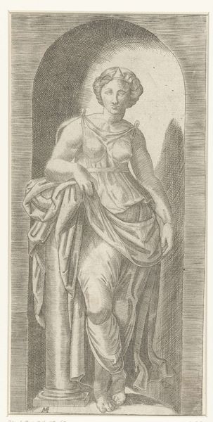Curator: Let’s spend some time with this engraving, "Foedus, from Proposopographia." It's believed to be the work of Philips Galle, dating from somewhere between 1580 and 1595. Editor: My immediate thought is how effectively Galle renders texture, the lines defining form, the flowing drape of the woman's dress. The detail, created with such a direct process, gives a solidity to what would otherwise just be symbolic. Curator: Indeed. "Foedus," meaning "treaty" or "covenant," is represented allegorically. Observe the female figure holding a device with multiple strands, suggesting the binding nature of agreements. The figure and object, combined with the text inscription below, work together to embody the abstract idea of unity through covenant. Editor: The artist’s choice of printmaking itself echoes this idea. Engraving, with its laborious and meticulous process, involves many stages of transfer, reworking, and pressure. This itself reflects the layers involved in solidifying agreements between people. Curator: That’s a great point! Moreover, her contemplative downward gaze emphasizes the weighty responsibilities that such covenants demand. And there is an undercurrent of Mannerist influence throughout this period. Editor: I think looking at her garment also speaks of artistic production and labor. The layered fabrics, the delicate cap – are all testament to how things are brought together through work. Galle's choice of depicting this is so clever, a true visual condensation of complex historical realities. Curator: Seeing these historical artworks help us to think about current ideas of contracts and covenants today. Are our global systems of trade held together as well as we might imagine? What sort of image might Philips Galle produce if they were alive today? Editor: Well said, and that also prompts me to wonder what tangible materials hold up our own agreements. This image makes the implicit visible, provoking new approaches to systems of value, and the processes that create cohesion.