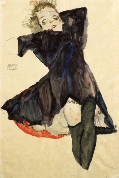 Editor: Henri de Toulouse-Lautrec’s "Woman Putting on Her Stocking," from 1894, is a coloured pencil drawing. There is something intensely personal and intimate about the subject, caught in this everyday act. What strikes me is how unfinished it seems. How would you interpret this work, focusing on its formal aspects? Curator: Indeed. The incompleteness you perceive is integral. Note how Lautrec employs line - rapid, broken strokes of colored pencil defining the form. He isn't interested in rendering a perfectly realistic figure, but rather capturing the essence of a fleeting moment. Observe the restricted palette - ochre, blue, white. These colors, sparsely applied, create a sense of depth and volume while emphasizing the flatness of the picture plane. Consider how the negative space functions here, as well, as critical. Editor: I see what you mean. The background isn't just empty; it's part of the composition. The negative space almost outlines the figure. Does the figure's pose also play a role in understanding the work formally? Curator: Absolutely. The slightly awkward pose, the way she bends to put on her stocking, creates a dynamic tension within the composition. This asymmetry avoids static perfection, giving a lively, and real impression of everyday life. It's a formal rejection of idealized representations, wouldn't you agree? Also, consider the way line and color direct the eye. What does your eye focus on, initially? Editor: My eye is drawn to the stocking itself. The darker blue makes it stand out. And I guess the way he focuses on this one section of the body. Curator: Precisely. Lautrec isolates and accentuates particular forms through color and line to explore depth and dimensionality, thus inviting you to participate in an act of constructing both form and meaning through the formal qualities that make up the art object. Editor: It's fascinating to consider how the formal elements, the line, colour and form, construct a work like this! It has been illuminating to focus on composition rather than subject. Curator: Agreed. It prompts a richer understanding of what an image conveys and invites critical investigation of why the artist’s deliberate stylistic choice might contribute towards.