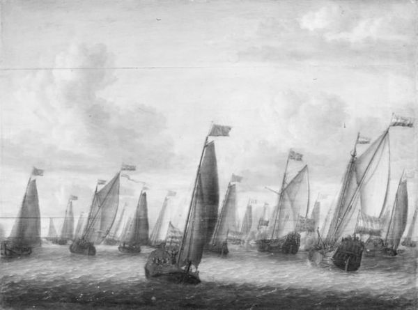 Thomas Heeremans painted this seascape with oil on canvas, capturing the maritime energy of his time. The ships aren't mere vessels; they are potent symbols of trade, exploration, and the human drive to traverse the unknown. Consider the ship, a motif laden with historical weight, appearing in ancient Egyptian funerary boats meant to carry souls to the afterlife and Viking longboats symbolizing conquest and discovery. Here, the ship carries the weight of Dutch mercantile power, yet its vulnerability to the whims of the sea evokes a primal human confrontation with nature. The sea itself acts as a mirror reflecting our subconscious, its turbulent surface stirring deep-seated emotions. Like the recurring flood myths across cultures, from the Epic of Gilgamesh to the biblical narrative of Noah, the sea embodies both destruction and renewal, a constant cycle etched into our collective memory. The symbolic power of the sea and ships in Heeremans's painting reminds us that history is not linear but a continuous, cyclical return of archetypes, each time reshaped by cultural and psychological forces.