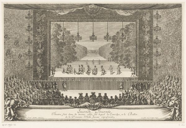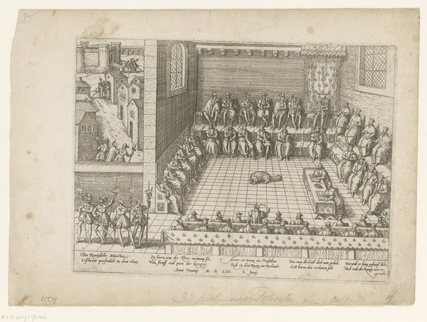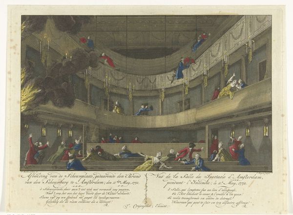 Editor: This is "Hanengevecht in Havana," or "Cockfight in Havana," an engraving by Frédéric Mialhe from around 1848. The print captures a scene buzzing with tension; the close, circular composition seems to amplify the energy of the crowd. What formal qualities strike you most? Curator: The use of line is particularly effective here. Note how the tight, rhythmic lines define the architecture, emphasizing the enclosed space. See how the variations in line weight and density delineate the figures and suggest the textures of their clothing. The scene appears carefully constructed. Do you notice how the composition reinforces this? Editor: I see the layering – the crowd circles the pit, and the pit frames the birds in their tense confrontation. How would you interpret this careful construction? Curator: Let us consider the structure. The foreground plane presents figures interacting with the focal point: the roosters engaged in combat. Behind them is a layered perimeter constructed of human observation. These figures become architectural. How do their gestures interplay? Are we able to gather information about them from the way they point and reach, from how the lines communicate these interactions? Editor: Their excitement builds upwards in this vortex, and your point about the texture is so right; the shading on their clothes gives them all individual weight. Does the composition tell a story of both chaos and precise structure? Curator: Indeed. Mialhe creates a dynamic yet rigidly defined scene. Each element reinforces the other, forming a cohesive and visually arresting whole. How might we apply a theory of semiotics to interpret the gesture in this space, considering the placement of each hand? Editor: I now understand how form shapes perception and creates meaning. It really elevates my appreciation for the artwork! Curator: Likewise, examining these details sharpens my understanding. Thanks for taking the time.