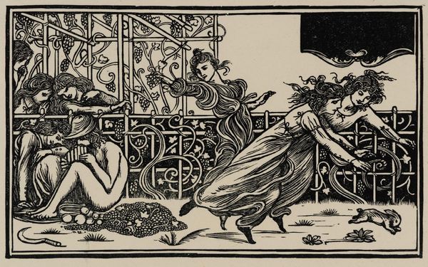 Curator: Aubrey Beardsley created this drawing, "The Birthday of Madame Cigale," sometime before his death in 1898. I’m struck by how delicate the lines are, almost like lace. Editor: It’s darkly whimsical, isn't it? The figures seem to float across the scene, caught between celebration and something more sinister. Curator: Absolutely. Beardsley often used stark contrasts and elaborate ornamentation to explore themes of beauty and decadence. The peacock feathers, the stylized flora—they're all symbols of vanity and artifice. Editor: And consider the title. The cicada, in folklore, often represents rebirth, but here, associated with "Madame," it hints at the performative nature of femininity and the pressures of social spectacle. Curator: The artist seemed deeply interested in the power of visual language to both conceal and reveal psychological truths. Editor: It's interesting to view this work through a contemporary lens, given Beardsley's short life. It makes the art seem even more poignant and invites reflection on identity and mortality. Curator: Indeed, it makes one ponder the eternal cycles of life and art. Editor: Precisely. The artwork has certainly resonated with me and has given me a new perspective on Beardsley's legacy.