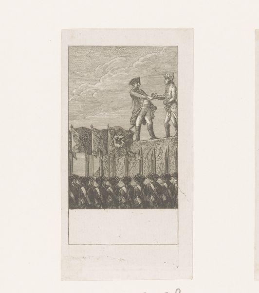 This small, anonymous engraving presents a stark scene of soldiers inspecting fallen comrades. The composition is divided horizontally, with the lifeless bodies in the foreground contrasting with the active military scene in the background. This division creates a disjunction between individual tragedy and the ongoing mechanics of war. The use of line is particularly striking. Fine, precise lines detail the uniforms and facial expressions of the observing soldiers, while the bodies are rendered with a softer touch, emphasizing their vulnerability. This contrast highlights the formal distance between the living and the dead, suggesting a cold, detached view of warfare. The rigid posture of the inspectors and their ordered arrangement behind the bodies implies a hierarchical structure of power, where the value of individual life is subordinate to military objective. The artwork is devoid of sentimentality. Instead, it offers a sobering reflection on the impersonal nature of conflict and the structures that perpetuate it.