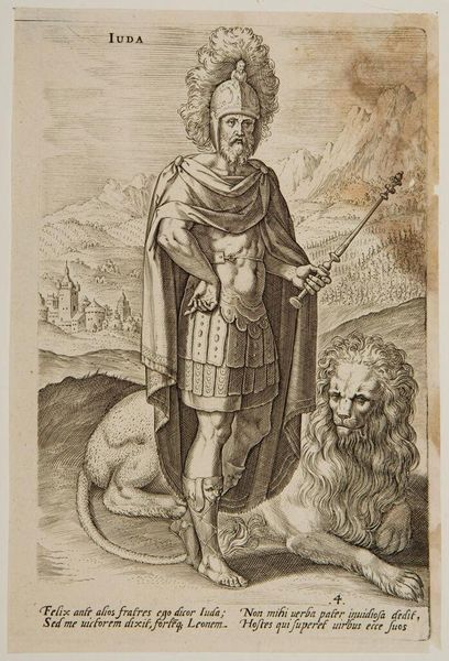 Curator: This is an engraving by Johann Sadeler I, created around the late 16th century, titled simply, "Dan." The print resides here at the Harvard Art Museums. Editor: The drama is intense! The contorted figure falling from the horse, the coiled snake, and the stern figure of Dan himself, all contribute to a powerful, if somewhat unsettling, scene. Curator: Indeed. This print is part of a larger series depicting the sons of Jacob from the Hebrew Bible. Sadeler, working within a rich visual tradition, uses the image to comment on Dan's prophetic blessing, associating him with cunning and judgment. Note the Latin inscriptions adding further layers of interpretation. Editor: The lines are incredibly detailed. The texture of the horse’s mane, the drape of Dan's garments, even the scales of the snake... It speaks to the skill involved in the engraving process itself. The labor is evident. Curator: Absolutely. And it reveals the socio-political function of prints at the time. These images circulated widely, shaping perceptions of biblical narratives. Editor: Seeing this image prompts me to think about how visual culture was disseminated and consumed back then. Curator: It all ties to production, interpretation, and, of course, the ongoing negotiation between text and image.