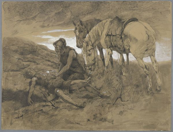Curator: This delicate artwork is titled "Bizani," created in 1913 by Thalia Flora-Karavia, likely rendered with pencil or charcoal on paper. Editor: There’s something haunting about this sketch. It feels like looking at a half-remembered dream. That lone figure, the burdened animal… they evoke a sense of quiet solitude and weariness. Curator: Yes, and considering the socio-political climate of 1913, just before the Balkan Wars intensified, this stark imagery takes on deeper resonance. The loaded animal may represent the burden and uprooting experienced by populations at this time. It has a poignant association. Editor: I hadn’t considered the war context, but that makes the mood all the more palpable. It transforms the image, I now feel that solitude and weariness are tied to collective trauma, to cultural displacement. Curator: Exactly! The sparse use of line and the pale palette reinforces that emotional austerity. Flora-Karavia employs this "underpainting" technique to great effect here. Even the ambiguity becomes meaningful—we don’t see their faces, amplifying the universality of the scene. Editor: And even incomplete sketchy elements give it an immediate quality. It’s raw, but vulnerable, isn’t it? As if this were recorded from an uprooted perspective. One is reminded that sketch art holds such importance precisely because it’s portable, democratic, made on the spot in ever-changing landscapes. Curator: The repetition of stark and somber imageries like these certainly solidify shared collective memory and continuity of suffering among cultures affected by armed conflict and massive uprooting of populations, like Greece at this time. This may be Flora-Karavia's legacy as an iconographer. Editor: A sobering reflection, but so vital for understanding both the artwork and its historical echoes. Thanks to that sketch art endures the moment as its larger significance unfolds. Curator: A most interesting point of view which offers a more human-level approach. The convergence of views such as these makes artwork exploration so important.