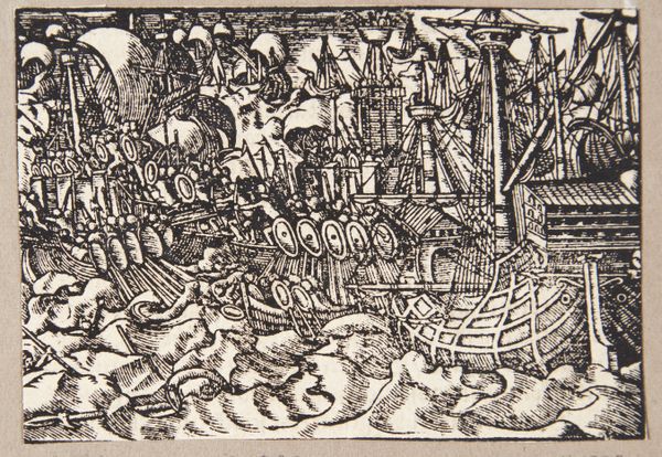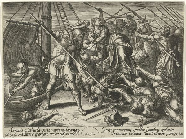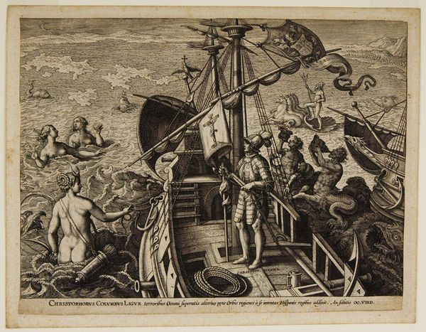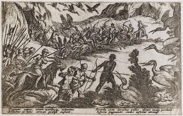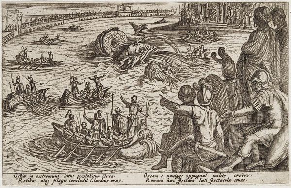 Editor: This is Antonio Tempesta's "Seamen Diving for Coral," made sometime between 1555 and 1630. It looks like an etching or engraving. I’m struck by the frenetic energy of the scene, everyone working and moving! What catches your eye? Curator: Ah, a perfect little storm of industry! I love how Tempesta captures that moment of intense activity. It reminds me that even seemingly mundane tasks—like coral harvesting—can be filled with drama. What do you make of the text along the bottom? It seems to be a description of the process. Editor: It looks like Latin. I'm guessing it has something to do with the coral changing color when it's brought to the surface. Is that something Tempesta would have observed directly? Curator: Perhaps, but it also speaks to something deeper, doesn't it? The transformation from hidden beauty to something revealed. That contrast is what makes this piece so captivating. Editor: Absolutely! I never would have thought of coral harvesting as something beautiful, but now I see it differently. Curator: That’s the magic of art, isn’t it? Shifting our perspectives, one tiny etching at a time.