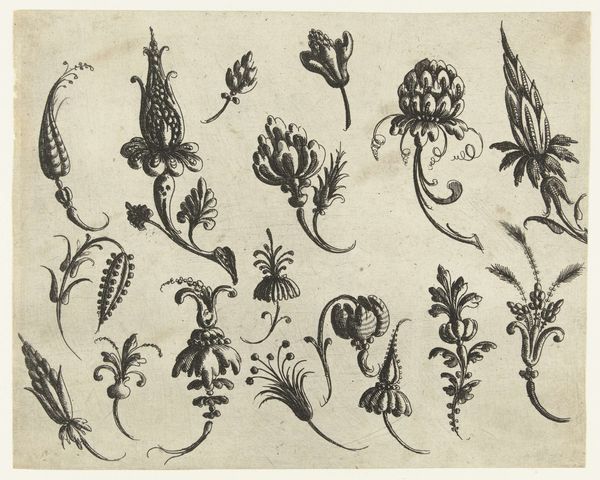 Editor: Here we have Nicolaes de Bruyn's "Flowers and Butterflies," created in 1594. It’s an engraving, full of meticulously rendered botanical and insect specimens. I'm struck by its almost scientific precision, but also its decorative quality. What do you make of this piece? Curator: It’s fascinating how the work straddles art and scientific illustration. In the late 16th century, the boundaries were blurred. Botanical prints like this one were becoming increasingly popular, fueled by growing global trade and a thirst for knowledge about the natural world. Editor: So, it’s tied to exploration and discovery? Curator: Absolutely. Consider the context. This was an era of extensive colonization and the rise of scientific societies. These kinds of images fed a European audience eager to catalogue and understand newly encountered flora and fauna. Were these engravings used for scientific research or decorative purposes? Do you see a clear function for art or science in here? Editor: I guess both! I see how this reflects a period keen to document the natural world but I had only thought of them as "still lifes". It's eye opening to consider this as part of the wider picture of the 16th Century. Curator: Exactly, it invites us to reflect on how the production and reception of images are shaped by broader social and intellectual trends, a very nice object of its time. It really reveals how even the seemingly innocent images can reflect significant shifts in power and knowledge. Editor: It's amazing to consider the social context and see how this artwork bridges different worlds, art and science, but also trade and exploration!