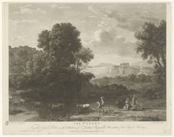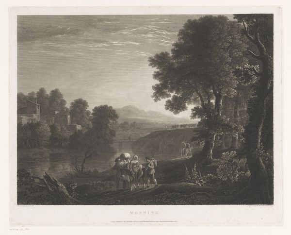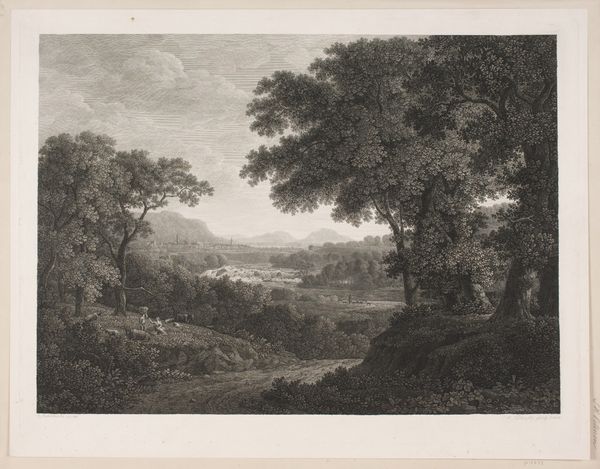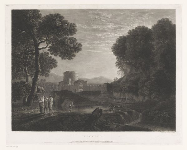 Editor: This is "Le Soir des Bergers," or "The Shepherd's Evening," an etching and engraving made in 1828. I find it to be incredibly detailed and picturesque. What catches your eye when you look at this piece? Curator: The painstaking labour inherent in etching and engraving, particularly to create this level of detail, speaks volumes about the value placed on handcrafted art in the 19th century. The material process is itself the meaning. Editor: Could you expand on that a little? I guess I am stuck in thinking about the landscape. Curator: Think about it this way: Why choose such a labor-intensive medium to depict a pastoral scene? Was this intended for mass consumption? If so, what does that suggest about the target audience and their relationship to the depicted landscape? Consider, also, how the etching medium, with its emphasis on line, might evoke a sense of idealized order being imposed upon the natural world. The very act of creating this print is an intervention. Editor: So, instead of the romantic landscape, we think about the printing trade? Curator: Exactly. The division of labor within the printmaking workshop itself might offer insights into social hierarchies. Who designed it? Who executed the lines? Who printed it? Each stage reflects power dynamics. Editor: That's fascinating! I hadn’t considered that angle at all. I see now that focusing on the materials and methods really opens up new avenues for understanding the work. Curator: Precisely. It is through understanding the work process that you may unlock what it reflected during the epoch it was crafted, as well as the labor and consumption relationship with art.