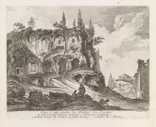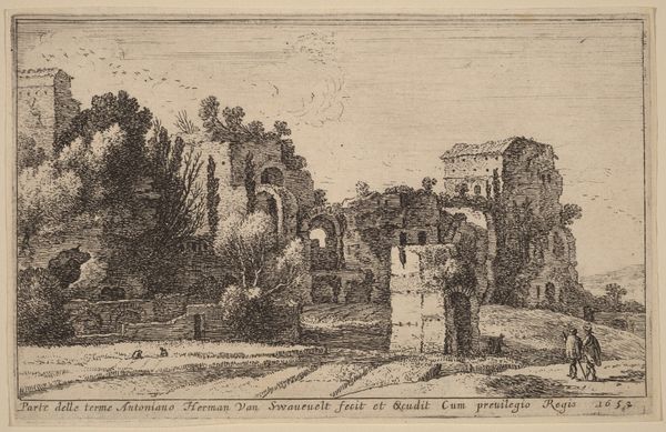 Curator: Nicolas Perelle created this engraving titled, "Gezicht op de thermen van Diocletianus," sometime between 1640 and 1660. Editor: It’s fascinating how the detailed lines contrast so starkly against the emptiness of the sky, almost rendering the architectural elements as ghostly remnants. Curator: Indeed. Perelle’s perspective offers not just a visual record but a meditation on power, history, and the city of Rome itself. Consider the figures in the foreground, likely nobles or Grand Tourists. They symbolize a kind of continuation of imperial interest and appropriation. Editor: I’m struck by the deliberate arrangement of light and shadow that calls attention to the arches—the very skeleton of the baths. It is almost as if Perelle invites us to explore how architectural language can communicate profound social commentary. Curator: Precisely! Think about the context: These baths were a public space meant to serve the social needs of the many, yet here they stand, ruined and observed by what seems to be a privileged few. Editor: Do you see the couple standing silently just to the right of the ruin? How can we interpret that juxtaposition of decay and vitality? The whole design seems almost…staged. Curator: That placement likely reflects how Baroque art served specific political agendas and narratives. In depicting Rome, Perelle's intention extended beyond mere observation, engaging with then-current debates around authority, societal transformation, and, naturally, spectatorship itself. Editor: What do you make of the distant, dream-like quality of the city center? How much artistic liberty has he employed, do you think? It has an almost… separate reality about it. Curator: I think Perelle blurs fact and idealized fiction. He acknowledges time’s impact while simultaneously commenting on contemporary social structures. He's reminding us that even ruins tell stories of social hierarchy and enduring legacy. Editor: After taking a closer look at how carefully Perelle considered form, one cannot but feel humbled by our place in the seemingly endless river of social history.