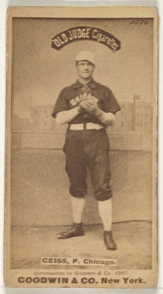 This is a photograph of baseball player Sullivan of Chicago, issued around 1887 as part of a series of cigarette cards. Sullivan is seen holding his baseball bat across his body, a posture that echoes the ancient contrapposto stance seen in classical sculpture. This stance suggests a balance between tension and relaxation, hinting at a readiness to spring into action. Think of the Doryphoros of Polykleitos; that sculpture embodied the Greek ideal of harmonious proportions, while Sullivan embodies the American ideal of athletic prowess. Just as the Doryphoros was a symbol of youthful strength and civic virtue, so too does Sullivan evoke a sense of national pride and the burgeoning culture of American sports. In both, we see how the body becomes a vessel for cultural values, shaped by collective desires and aspirations. These images tap into primal emotions, speaking to our shared human experiences of competition, admiration, and the pursuit of excellence. Consider how this symbol of athletic readiness has evolved – from the classical sculptures of antiquity to a baseball card in nineteenth-century America. A cyclical return to the past is made visible in the present, constantly renewing itself.
