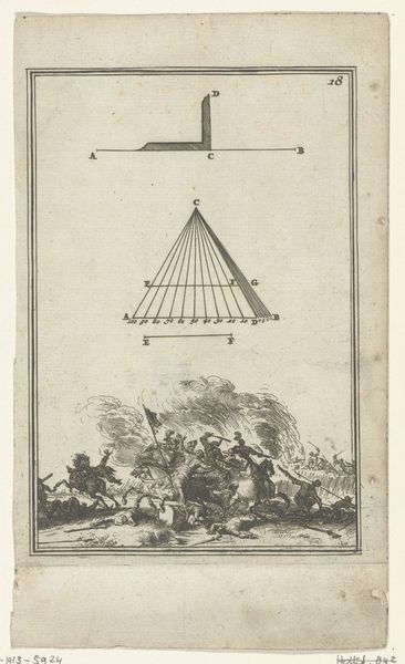 This illustration for Allain Manesson Mallet’s ‘Den Arbeid van Mars’ was made around the turn of the 18th century by Romeyn de Hooghe. It's an etching, a printmaking technique that uses acid to cut into a metal plate, which is then inked and printed onto paper. The image is divided into two distinct sections: at the top, a geometric plan of a fortress, rendered with precise lines; below, a lively battle scene, filled with figures and action. Look closely and you can see how the stark precision of the fortress plan contrasts with the chaotic energy of the battle. Etchings like this were produced in multiples, like a form of industrial production. De Hooghe’s skill in this technique allowed for the widespread dissemination of military knowledge and, perhaps unintentionally, glorified the brutal realities of war, turning them into a kind of spectacle for mass consumption. This work is a reminder that even seemingly technical drawings can be deeply embedded in the social and political contexts of their time.
