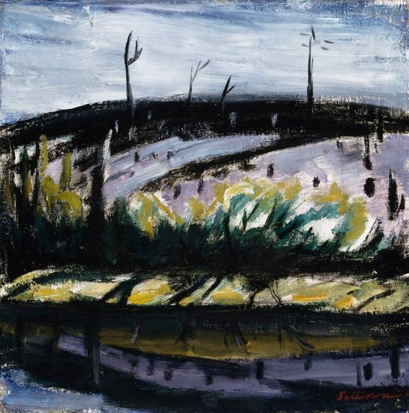 Curator: Rudolf Bér, an artist of significant presence but whose exhibition history could perhaps benefit from greater institutional visibility, painted "Evening". It's oil on canvas. Editor: Visually, it feels… submerged. The monochromatic blue palette lends a heavy, dreamlike quality. Is that a landscape? The forms seem almost architectural, like underwater ruins. Curator: It is a landscape, distilled through the lens of abstract expressionism. Bér clearly engaged with the formal innovations of his contemporaries but wasn't merely imitating them. Think about the mid-century context, when the dominance of American abstract expressionism prompted artists globally to grapple with questions of national and individual identity through abstraction. Editor: That's precisely what draws me in. It speaks to a negotiation with a dominant aesthetic. The pervasive blue, rather than conveying peace, feels weighty, almost oppressive. It makes me think about climate grief, of places being swallowed. Is that anachronistic? Curator: Perhaps, but that emotional resonance speaks to the painting's continued relevance. Abstraction often transcends specific historical readings, acquiring new meanings in dialogue with subsequent generations and sociopolitical landscapes. There’s also a rawness in the paint application, it pushes the traditional genre conventions of landscape into abstraction in ways that prompt complex discussions of political, ecological, and personal impacts and changes over time. Editor: Definitely. The title "Evening," it is an invocation of the natural world but then the shapes become less trees, and more oppressive monoliths. It reflects on the history, while simultaneously using the artistic language of abstraction. This painting almost predicts what late stage capitalism can potentially make of any evening. It speaks to anxieties we collectively carry about landscapes changing, and that dialogue should never be considered outside a political landscape. Curator: Precisely, an abstraction’s power is, it is not confined by historical circumstances of production. Bér's painting gains depth when viewed through a contemporary lens, allowing us to grapple with the anxieties and premonitions embedded within its composition. Editor: The conversation certainly broadened, which I think is the purpose of art. Thank you for discussing "Evening" with me. Curator: It's always enlightening to engage in such discussions. Thank you.
