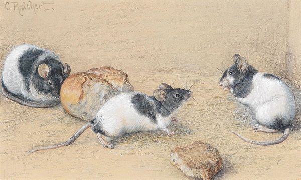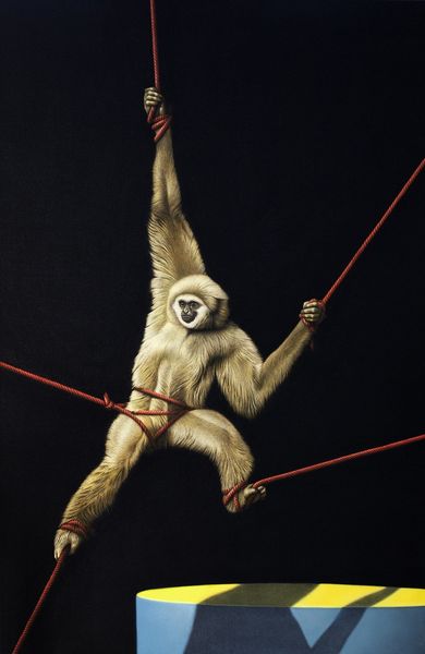 Curator: Here we have "Gym Rat", a delightful oil painting by Lucia Heffernan. Editor: Well, isn't that a charming, slightly unsettling juxtaposition. The sheer visual irony is rather palpable! A rodent...boxing? The composition is strangely captivating. Curator: Indeed. Note how Heffernan uses a genre painting style to portray a very unusual subject: an anthropomorphized white rat assuming a martial arts pose. The textures are remarkable, particularly the way she handles the fur and the glossy boxing gloves. Editor: The artist's material choices also reflect deeper social themes. Oil paint is a traditionally upper-class medium. Painting this scene with that specific medium and in such careful, traditional technique lends this comical rodent dignity, maybe even suggesting commentary on access and labor. Even that roughly-sewn punching bag contributes. Curator: Interesting take. Structurally, the high-key value of the rat immediately attracts the eye against the somber background. Observe the use of lines - the diagonal of the raised leg contrasting to the rigid vertical lines of the punching bag. A somewhat dynamic composition overall, wouldn’t you agree? Editor: Yes, I agree! Look closely at the textures on the boxing gloves, almost like car tires in miniature form. They give the image depth and suggest an actual manufacturing process and the creation of labor in commodity goods, don't you think? The means of production become a subject, not just a background. Curator: I suppose one can see that interpretation. I was leaning towards analyzing how the light subtly emphasizes the figure and delineates it from its environment. The semiotic play between the predator image of the cat crudely drawn on the bag, juxtaposed with our gym rat hero… brilliant, really! Editor: Exactly. The cat sketch references a predator, but consider what that hand-drawn crudeness communicates about its creation. Someone made that, with very clear intent. The artist is not shying away from the messy human labor involved in making symbols. Curator: Food for thought. It appears our pugilistic rodent contains more layers than one might initially presume. Editor: Absolutely. And for me, it truly illuminates art’s social fabric woven into the very techniques the artist employs.