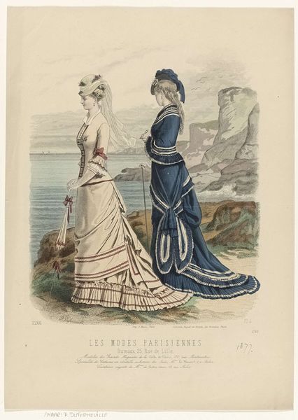 Editor: Here we have a print from 1884, titled "La Mode Illustrée, No. 30", attributed to Charles Rabouille. It seems to be a fashion plate depicting two women on a beach. The scene has a rather tranquil, almost dreamy feel, like a memory gently fading at the edges. What catches your eye, looking at this piece? Curator: Dreamy indeed! For me, it's all about the art of *suggestion* here. Rabouille isn’t just showing us dresses; he’s evoking a whole lifestyle, a moment snatched from the gilded cage of late 19th-century Parisian society. The beach setting—slightly blurry, more felt than seen—becomes this liminal space, a whisper of freedom. Don’t you feel a little voyeuristic, like we’re eavesdropping on their escape? It's almost like the dresses are characters themselves, telling us something about the aspirations and constraints of women at the time. Editor: Absolutely, I feel that! And that dark dress with all those buttons looks so stiff compared to the flowing gown with the flowers. But what about that beach in the background, those indistinct figures in the background? Why are they there? Curator: Ah, the background figures. See how they almost melt into the sand? It emphasizes that the scene isn't just about clothes; it is about capturing a *mood*, an essence. Those blurry figures are about contrast -- suggesting leisure, society, the *scene* of things. Like a stage set. Editor: I never thought of them that way before, that is insightful! Thanks. I’m finding this almost comforting somehow; the imperfections give it a life a photograph wouldn't have. Curator: Exactly! It's like catching a scent of lavender; it isn't the plant itself, but a trace, a memory blooming.