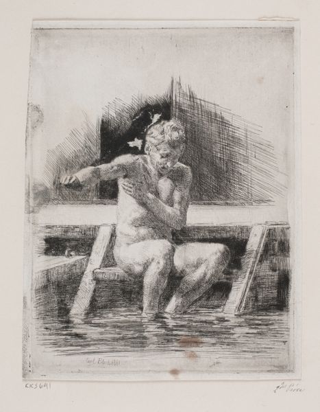 Curator: This etching from 1912, created by Anders Zorn, is titled "The Hair-Ribbon". Editor: The piece seems a bit stark, almost unfinished, with all the hatching and crosshatching used to create its shading and tonality. Curator: As a print, its material existence stems directly from the metal plate, the acid, the press—the tangible elements. Each line represents the labor, a deliberate act of inscribing, quite unlike painting where gestures can be concealed, perhaps even more so when the scene depicted is a nude one. Editor: Speaking of which, her pose has a classical air, don't you think? She's seated, somewhat contemplative, the dark hair-ribbon acting as a framing device. There's a tension in the composition. Curator: Yes, the interplay of light and shadow draws the eye immediately, specifically in this piece as the dark backdrop suggests an undefined and somber domestic space, one created via many marks. Editor: I'm wondering what exactly the woman in the portrait is looking at, considering the gaze isn't directed at the viewer but turned instead to the side—we see only a fragment of her environment and life as a whole. It evokes questions about female labor as it occurs behind closed doors. Curator: Agreed, and Zorn's technical skill highlights form with an almost sculptural presence despite the relatively flat character of the etching process itself. The marks perform as much as they record the world before his eyes. The subject seems caught at a turning point, self-contained and absorbed within her individual reality, despite what might await her outside. Editor: Thinking about how an image such as this circulated historically as a kind of readily available printed matter feels radical given the current setting within the context of a museum collection, however fine the artistic skills are displayed throughout. Curator: Precisely. This detailed observation reveals a world rich in social nuance and layered meanings and implications about the female form. Editor: An apt conclusion to considering the implications behind the printmaker's means of representing labor and life at once, while raising important considerations around viewing today.