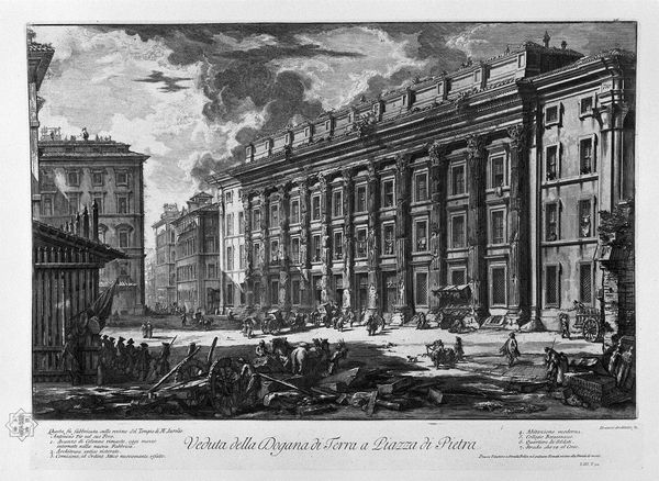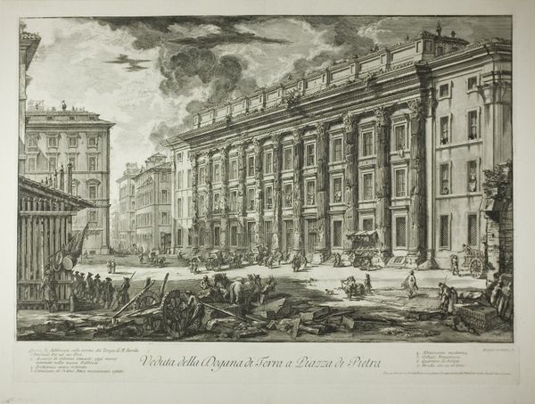 Curator: Looking at this print, I feel an overwhelming sense of human industry dwarfed by classical grandeur. It’s almost melancholic. Editor: It’s easy to get swept away by the sheer scale. This engraving is from Giovanni Battista Piranesi’s series “Vedute di Roma” or "Views of Rome." We’re seeing his rendering of the Piazza di Pietra, dominated by the remains of Hadrian's Temple. Curator: Ah, Piranesi. He's a master of visual storytelling. Even though it's just an architectural rendering, notice how the figures aren't mere decorations. They inject an energy, a pulse. And the deep shadows lend the whole scene this romantic feeling. Editor: Precisely. And that's what made his prints so popular. This image gives us access to how the city operated, what public life was like. He catered to a Grand Tour audience, folks eager to bring home views of these historic monuments. It shows us how classicism became enmeshed in the 18th-century tourist gaze. Curator: It also brings up ideas of temporal decay and how collective memory is constructed. You see that imposing architecture, but also the everyday bustling market—juxtaposing an ideal vision of Rome with lived experience. Editor: Right, he’s layering narratives, both the Roman Empire of the past, and the mercantile realities of his present. Curator: Also the shadows carry so much visual information; like, darkness implies untold stories of that architecture—history's unwritten aspects become symbolized within. The emotional heft of looking back. Editor: Well, and the image-making has its own politics. Piranesi used illusionistic techniques to control perspectives, dramatize the image—it's hardly a neutral view of Rome. What it chooses to include and exclude makes the case. Curator: Ultimately it's about conjuring a feeling; that timeless pull of the place is quite poignant and powerful in his skilled hands. It remains evocative despite— or because of— its staged effect. Editor: I see how this enduring visual makes you pause and ponder. Hopefully, it sparks something similar for our visitors, making them think of how visual culture and classical heritage shape identity.
