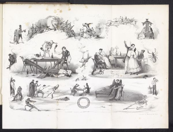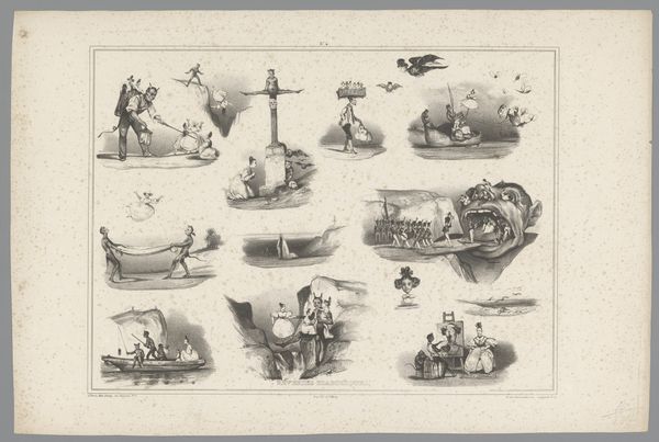 Editor: This etching by Charles Ramelet from 1832, titled "Veertien voorstellingen rond duivels en vrouwen," which translates to "Fourteen scenes around devils and women," is a series of miniature narratives. What strikes me is the almost humorous yet unsettling portrayal of power dynamics here. How do you interpret this work? Curator: It’s interesting you pick up on the power dynamics. Consider the period this was made, a time of shifting social structures and anxieties surrounding gender and morality. Ramelet’s work presents a fascinating, if troubling, lens through which to view these anxieties. Notice how women are often paired with devilish figures. Editor: Yes, there’s definitely a recurring motif there. But what do you make of the variety of scenes, some seemingly domestic, others more overtly fantastical? Curator: This variety allows Ramelet to explore the devil as a metaphor for societal temptations and moral failings, often implicating women. The domestic scenes, in particular, hint at the subversion of traditional roles, a dangerous idea at the time. But I wonder, is Ramelet simply reinforcing patriarchal anxieties, or is there a subtle critique embedded within these scenes? Editor: That's a good question. The absurdity of some of the scenarios makes me think there could be an element of satire. Perhaps Ramelet is highlighting the ridiculousness of these anxieties? Curator: Precisely. And that ambiguity is key. This print becomes a site of negotiation between societal norms and their potential disruption, a reflection of the complex relationship between gender, power, and morality in the 19th century. What seemed a humorous collection of images might reveal the subtle tensions of its period. Editor: Looking at it that way definitely gives me a new perspective, it seems the "fourteen scenes" really offer much to analyze with a new context in mind. Curator: Indeed, it is a powerful demonstration of how artistic expressions have documented socio-cultural evolution.