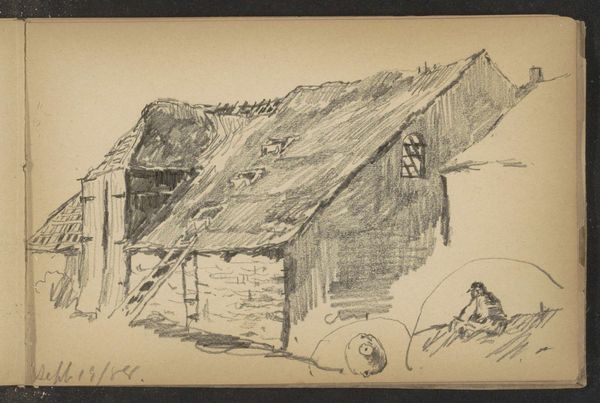 Curator: Here we have "Farmhouse with a thatched roof," created by Willem Cornelis Rip, around 1896-1897. It appears to be an ink sketch, likely from a sketchbook. What's your immediate impression? Editor: Faded sepia dreams, perhaps? A place someone left behind… You know, that perfectly imperfect quality. It feels very intimate, almost voyeuristic, as if we’re peering into the artist’s private visual diary. Curator: Absolutely. Sketchbooks, especially during this period, served as vital tools. They reflect the artist's raw observations and thought processes outside the formal constraints of a commissioned piece or a salon exhibition. It’s about capturing fleeting moments, testing compositions. Editor: Fleeting moments—precisely. The hasty strokes, the implied rather than explicit details... it invites you to finish the story yourself. The incomplete sections and the focus on the farmhouse's silhouette tell much about what the artist chose to emphasize: maybe a memory of rural life? Curator: Potentially. It also offers insights into the broader cultural trends of the time. There's a noticeable shift towards valuing everyday subjects – moving away from idealized landscapes or historical scenes. Rip’s choice suggests a fascination with rural simplicity, something also visible in contemporary works by artists like, say, Van Gogh and others. Editor: Yes! It is like feeling, as opposed to stating. I also enjoy the unassuming scale. There's no grandeur here, but a humbleness that invites introspection. No statement of public, social values, more like private whispers between the artist and subject. Curator: Precisely, and it reveals the changing function of art in the late 19th century. The burgeoning art market democratized visual culture. Sketches, like this one, which could have initially served merely as preparatory work, were recognized as artworks in their own right. It’s all interconnected: The societal shift toward individual expression and consumption created an opening for this kind of intimate artwork to be both created and cherished by a wider audience. Editor: That is something to cherish indeed! For me, that kind of artwork has special value in offering new ways of connecting through its incomplete view. It also shows how personal observation becomes cultural insight when viewed with others. Curator: Very well said.
