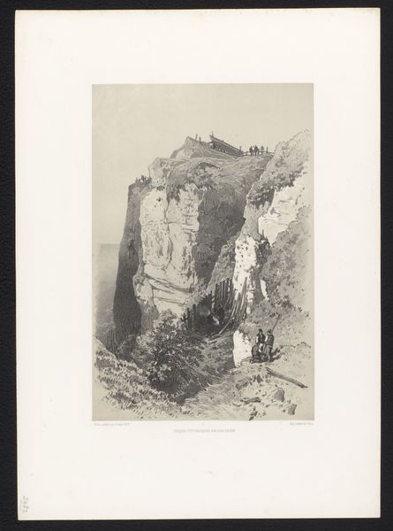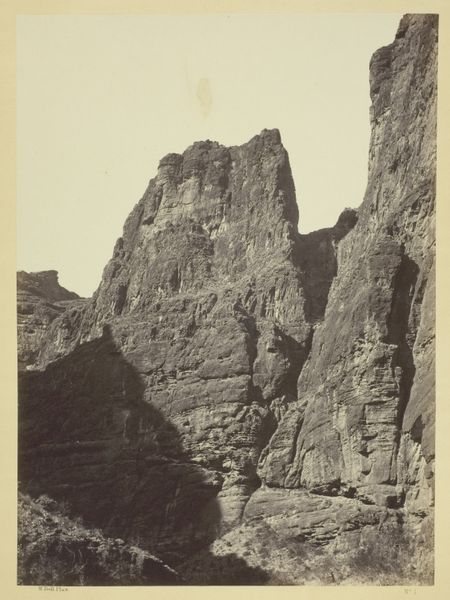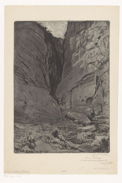 Editor: Here we have James Craig Annan’s 1910 gelatin silver print, "Schetsende man in rotslandschap," or "Sketching Man in Rocky Landscape." I'm struck by how the deep blacks contrast with the luminous rock face. What compositional elements stand out to you? Curator: Notice how the composition relies heavily on chiaroscuro, manipulating light and shadow to define form and space. The rock dominates, possessing varied texture, while the figure serves as a secondary focal point, almost engulfed by the environment. Does the figure’s size relative to the rock suggest something to you? Editor: Perhaps a sense of human insignificance within nature’s grandeur? I'm drawn to how the sharp detail in the rock transitions into almost complete darkness. Curator: Exactly. The photograph employs a skillful gradation, guiding the eye. Note how the photograph reduces the external world into formal arrangements. How do you think the medium of photography impacts our viewing? Editor: Photography is seen as documenting the world, but it is clear that the composition is carefully considered here. I appreciate the control of lighting, and the placement of the figure for scale and for focus. It makes me consider the relationship between the elements as well as their realistic depictions. Curator: A key point. In Annan's artistry, we see more than replication; it becomes about formal relations. The light, shadow, and arrangement are used to achieve visual harmony and guide the viewer. It transforms our perception from representation to abstraction and emotional impact. Editor: Thank you! Considering your explanation, I definitely have a richer view on the intention and artistic effect in this image. Curator: The visual structures shape our emotional experiences of art. A new composition means new insights.