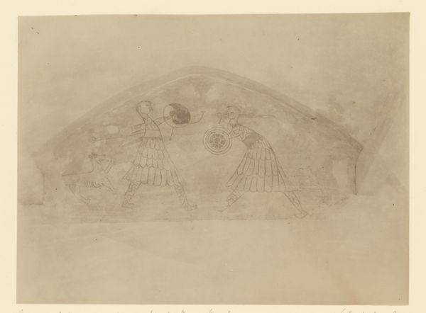 Auguste Salzmann created this photograph, "Jérusalem, Vallée de Josaphat, Fronton du Tombeau de Josaphat," using a waxed paper negative. The photograph emphasizes the stark geometry and textured surfaces of the ancient stone architecture. The somber monochromatic palette accentuates the material's rough, weathered quality. Note how Salzmann's choice of perspective and close framing transforms the tomb's fronton into a study of form and surface. The triangular pediment, adorned with repetitive, stylized floral motifs, is brought to the forefront. The linear precision of the carved lines contrasts with the organic decay of the stone itself. This interplay between geometric order and natural degradation invites us to consider the photograph not just as a record, but as an exploration of time, history, and representation. Salzmann subtly manipulates our perception, prompting questions about the relationship between the photographic image and the object it depicts. Is it a mere document or a constructed interpretation?