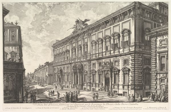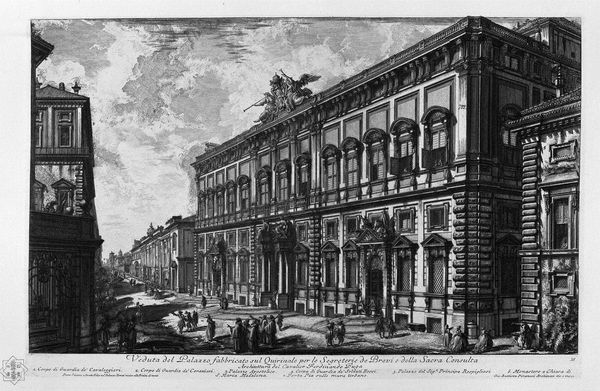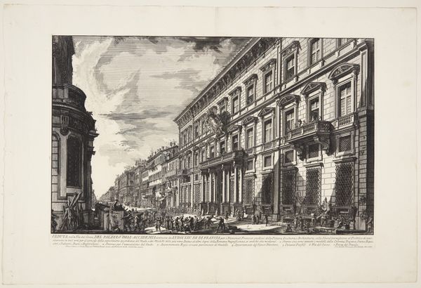 Curator: This is Giovanni Battista Piranesi's "View of the Palazzo Odescalchi, from Vedute di Roma," an etching dating from between 1748 and 1758. Editor: It’s imposing, even in monochrome. The precision of the lines, the sheer scale of the Palazzo, suggests power, a kind of unassailable dominance. But something feels…staged? Curator: "Vedute," or views, like this were extremely popular, offering Grand Tourists souvenirs of Rome's grandeur. Piranesi, though, wasn't just documenting; he was constructing an image. The Palazzo represents a consolidation of power—the Odescalchi family rose dramatically after Pope Innocent XI, Benedetto Odescalchi. The family's arms are visible on the facade. Editor: Exactly! The strategic positioning emphasizes the established hierarchy. Piranesi, like many artists then, navigated the delicate politics of patronage. There's a commentary here, veiled though it may be, on the architectural manifestations of social inequality and its impact on urban development. It is never a mere recording, but a political inscription in lines, tone and form. Curator: The "stagecraft," as you called it, involves manipulating perspective. He uses deep shadows, almost theatrical lighting, to amplify the monumentality, even though he carefully depicts everyday life through those diminutive figures. What symbolic role could they represent, juxtaposed against the powerful architecture? Editor: Well, the people become part of the tableau—almost props themselves—suggesting how ordinary lives are dwarfed, dictated by these structures. But are they witnesses, participants, or simply absorbed into the system, or all three? Also consider gender: where are women represented here beyond the token figures strolling and standing outside this place of presumed patriarchal authority? Curator: Your read offers insight into enduring symbolic themes related to the relationship of individual identity to place. And despite this being a 'reproducible' medium, an etching, its scale communicates cultural authority of this iconic, almost mythic representation of Rome and class stratification. Editor: It pushes us to consider what it means to monumentalize power and how urban space actively shapes lived experience. Curator: Looking again, I feel this is a space not only shaped but shaped through visual language. Thank you. Editor: Likewise. These buildings don't just stand; they speak.