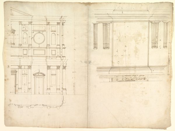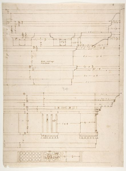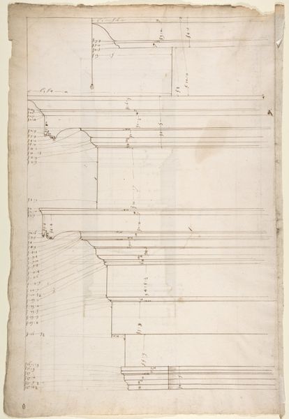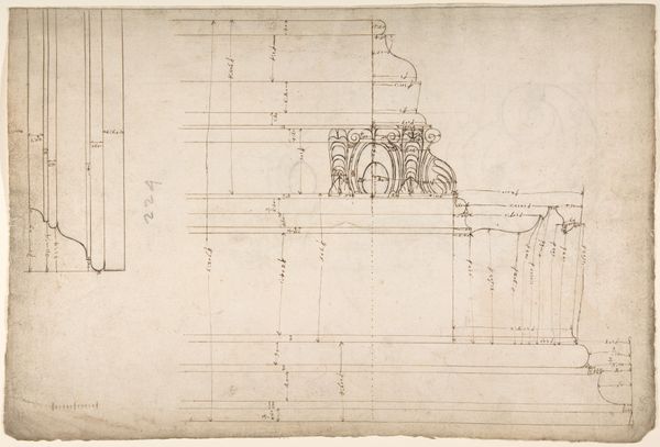 Curator: Here we have an intriguing drawing rendered in ink on paper, a work entitled “St Peter's, entablature profile; reflected ceiling details of the cornice, and profiles of column bases and pedestals (recto) / St. Peter's, section through drum of model and entablature of upper story (verso)." It was created sometime between 1500 and 1560 by an anonymous artist. Editor: Immediately, the delicate lines suggest precision and restraint. Despite being a preparatory drawing, the intricate details speak volumes about the envisioned grandeur of St. Peter's. Curator: Precisely. Note the meticulous articulation of the entablature, capturing a critical element of classical architecture through these structural elements and the refined articulation of form. It gives one a feeling of being privy to the very architectural genesis. Editor: I’m particularly drawn to the ceiling details. The cornice and column bases—they echo patterns of power and the sacred. Floral imagery evokes classical precedents, almost whisper the legacy and aspirations linked with St. Peter's as it connects with Christianity. Curator: Absolutely. The very selection of ink and paper itself suggests permanence. These details, frozen on paper, take on a weight and a resonance—becoming documents for a future, intended to last. Editor: In many ways, the drawing itself transforms into an iconic representation of the basilica. These profiles speak less of functionality and more about ambition, the physical and metaphorical building of St. Peter's representing the earthly ambitions of divine authority. Curator: And indeed, one finds in its clean lines a certain divine quality as the symmetry itself alludes to the mathematical harmonies underpinning both classical and Renaissance ideals. There is order in what may appear at first glance as chaos. Editor: Ultimately, this isn't merely a plan, it’s a visualization of both the human capacity to build, and faith. Curator: Quite right. An intersection of vision, structure, and a symbol rendered into a tangible form. Editor: An evocative start of an imposing monument.