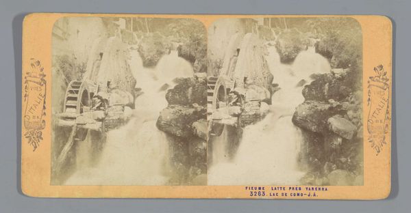 Editor: This stereograph, "Niagarawatervallen vanaf de Niagara Clifton Brug," or Niagara Falls from the Niagara Clifton Bridge, by George Barker, sometime between 1869 and 1889, presents us with a double vision of the iconic falls. The sepia tones and almost ethereal mist lend it a romantic, yet slightly melancholic air. What symbolic weight do you find embedded in this popular image of Niagara Falls? Curator: The falls themselves have always represented power, both natural and spiritual, for various cultures. Consider the Indigenous peoples who revered these waters. But with Barker's photograph, we also see the advent of tourism, the “taming” of nature through the lens of the camera. Does the bridge itself strike you as a symbol of this conquest? Editor: Absolutely. It's a structure imposed upon the landscape, facilitating our access and experience. Is there also perhaps a religious element, maybe the sublime experience diminished into consumerism? Curator: That's insightful. The "sublime" was often associated with the divine, with the experience of awe and terror in the face of nature's grandeur. By capturing it, packaging it for mass consumption, are we diminishing its power? Or perhaps offering a different kind of spiritual access, a democratized sublime for the Victorian era? Editor: A democratized sublime... that's a fascinating way to put it! So, Barker’s photo becomes a symbol not just of nature's power, but of the shifting ways we relate to that power through technology and cultural change. Curator: Precisely. The photograph speaks to the evolving relationship between humanity, nature, and the tools we use to understand it. It’s a powerful visual reminder of how our cultural symbols change and adapt over time.