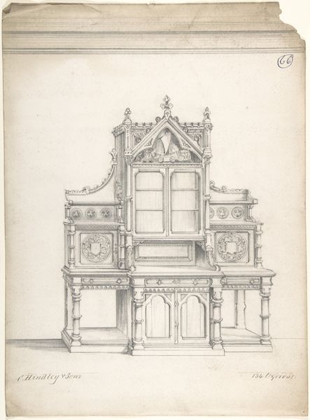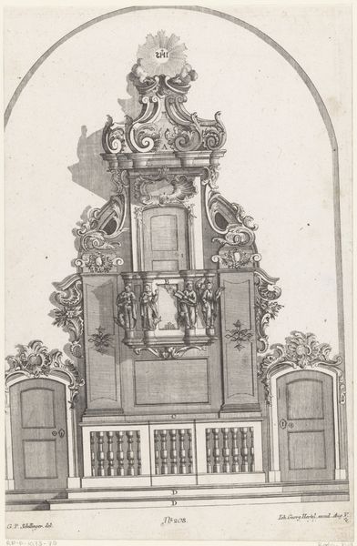 Editor: This is "Voorgevel van het Edams Museum," a cityscape created in 1896 by Wijnand Otto Jan Nieuwenkamp, using ink, pencil, etching, and other printmaking techniques. There's a remarkable stillness to it; it feels like looking at a ghost of a building. What catches your eye when you examine this piece? Curator: What resonates with me is how Nieuwenkamp captures the 'front' or facade, emphasizing the building's 'face'. Architecture, much like portraiture, reflects identity and status. How do the symbols embedded in this facade tell the story of the building and perhaps its inhabitants? Consider the symmetry, the height, and decorative details. Editor: It seems really meticulously rendered. The level of detail on each level draws me upward, trying to unpack the symbolism you mentioned. Is it typical for buildings from that time to be so ornate? Curator: Precisely! Ornate facades often signaled wealth and civic pride. Look closely at the sculpted figures at the top – do they evoke any particular emotions or associations? The etching medium itself is interesting; how does it contribute to the image’s narrative? Does the black and white color enhance that mood you first noted? Editor: They give a sense of stoicism, like silent witnesses of time. And, you're right, the medium makes it feel very austere and enduring. So much history is embedded here. Curator: Indeed. And etching allows for incredible detail, creating depth and texture, which accentuates the building’s tangible history. It makes me wonder, what stories these walls could tell. What’s the feeling of the thresholds this artwork invokes? Editor: I hadn't considered that—thresholds, indeed. It's been great learning to read a building's face like a portrait. Thanks for opening up that perspective! Curator: My pleasure. Seeing art as a text full of symbols unlocks a richer appreciation of cultural memory.