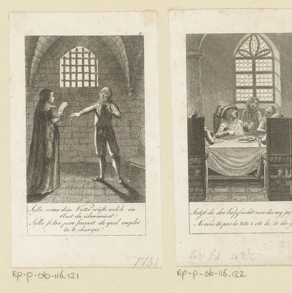 Editor: This is "Voorstelling uit de geschiedenis van de Nederlandse stadhouders," a print by Christian Gottlieb Geyser from 1796, currently housed in the Rijksmuseum. The artwork, etched and engraved, shows two distinct scenes, side-by-side, creating a sort of diptych. It feels very theatrical, with the figures arranged like actors on a stage. What can you tell me about it? Curator: The theatrical quality is key; the symbolic imagery and poses reflect not just historical events but how those events were meant to be *understood.* Note how in the left scene, the figure is elevated, literally enthroned; it echoes the imagery of power, dominance, and the expectation of deference. Do you see any other recurring visual symbols in both scenes? Editor: Well, the figure on the right seems confined, trapped almost, indicated by the barred window in the background. Perhaps it shows a loss of power, contrasting with the scene on the left? Curator: Precisely! The barred window is an enduring symbol of confinement and oppression, contrasting starkly with the open, almost performative, setting of the first scene. The visual language carries deep psychological weight, doesn’t it? These scenes employ familiar tropes – power versus captivity – which viewers then, and even now, can readily grasp. Consider how the clothing styles themselves contribute to this narrative. How do those speak to the theme? Editor: The attire seems quite formal and elaborate on the left, almost regal. The other one on the right looks quite ragged, simple; this might further emphasize that point about a reduction of status? Curator: Exactly. Think about how clothing in portraits can signal power, wealth, and social standing. Now, look at the gestures of each person and what they are conveying to others in these scenes. Gestures form a symbolic language of their own that viewers over centuries have come to recognize as signaling an exchange of words and meaning. Do these visual signals provide new understandings to your original interpretations of the piece? Editor: Definitely! I now perceive that Geyser used universal symbolism like gestures and clothing as much as literal depictions of history, imbuing this print with more resonance than just a record of past events. Thanks for enlightening me. Curator: My pleasure; recognizing these symbols unveils layers of meaning in artwork. It reveals connections across time and culture that inform history painting as well as portraiture.