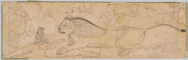 Curator: This is "Lion Tamer," attributed to Sadiqi Beg. It's a drawing, about 15 by 24 centimeters, currently residing at the Harvard Art Museums. Editor: It’s stark, isn’t it? That pale ground really throws the figures into sharp relief, like a dream half-remembered. I am interested in the dynamic of power shown here. Curator: Absolutely. There’s a tension to the composition—the tamer pulling, the lion resisting, or maybe playing along. I love the ambiguity. It feels like a very modern take on control. Editor: Or the illusion of control, certainly. Who is really leading whom, when we consider the long history of exploitation enacted upon wild animals. What does it mean to tame? Curator: Well, perhaps Sadiqi Beg is asking us to ponder that very question. I think the sketch-like quality adds to that. Nothing is fully resolved, which is exciting. Editor: Indeed. It leaves space for our own interpretations, inviting us to interrogate the social dynamics at play. Curator: Leaving us, perhaps, with more questions than answers. Editor: Which is always a good thing, right?