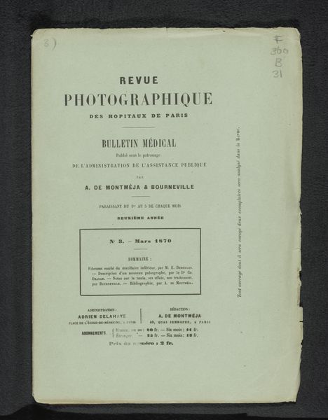 Curator: Here we have Léopold Verguet's "Photographie appliquée à la numismatique, monnaies romaines," dated April 1864. It seems to be a photographic print of a book cover. What's your initial take? Editor: It’s understated, almost austere. The monochromatic palette emphasizes the textual hierarchy. It makes me consider accessibility and audience: Who was meant to read and interpret these ancient coins? Curator: Verguet was indeed aiming for broad accessibility, utilizing photography to reproduce numismatic collections. Photography here democratizes access, extending it beyond those who could physically handle the coins or travel to view them. The museum in Carcassonne was clearly wanting to disseminate their holdings widely. Editor: Absolutely. The careful composition speaks volumes. It's more than just documentarian; there's a deliberate use of typography. The homage to Mgr de la Bouillerie, the Bishop, connects it to the power structures of the time, doesn’t it? It reminds us of the deep ties between religious institutions and the preservation of history. Curator: Precisely. And consider the broader context: mid-19th century France, a time of burgeoning interest in archaeology and history, fueled partly by nationalist sentiment. Roman coinage connected France to a glorious past, legitimizing its present. Editor: Yes, the appropriation of classical imagery is unmistakable. I find it interesting that a religious figure such as l'Abbé Verguet took part in the work on secular coinage imagery. It speaks to the convoluted dynamics that characterized 19th century society. This photography effectively transforms coins, objects imbued with economic power and social status, into vehicles for national narratives. Curator: These Roman coins gain new significance as they transition from currency to symbols. Through this photographic rendering and the book format, Verguet transforms them into portable artifacts, accessible to a growing audience eager to connect with their history. Editor: It makes you wonder, doesn't it, about the role of photography in shaping our collective memory. A powerful testament to the interplay of power, history, and representation, captured on a seemingly simple book cover. Curator: Indeed. This photograph allows us to reflect on the role of institutions in shaping perceptions of value and nationhood.