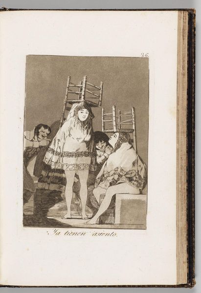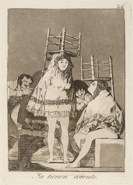 Editor: This is "They've Already Got a Seat" by Francisco José de Goya y Lucientes, currently residing at the Harvard Art Museums. It feels almost satirical, with the stacked chairs in the background and the women’s peculiar expressions. What do you see in this piece? Curator: Notice how Goya uses the chairs, symbols of status, in such a precarious, almost mocking way. The seated woman's gesture invites scrutiny. Do you think Goya critiques societal roles or perhaps explores the transience of power? Editor: That's a really interesting perspective; I hadn’t considered the chairs as symbols of status. The artist's subtle details are thought-provoking! Curator: Indeed, Goya invites us to reconsider what we value and who holds the power. A lesson that resonates through time.