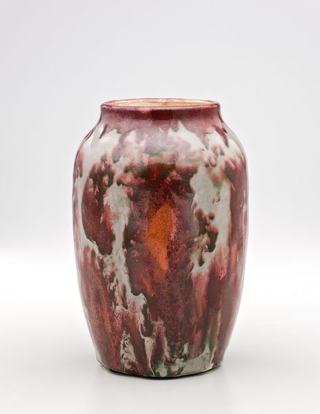 Editor: This is a ceramic vase, made by Chelsea Keramic Art Works sometime between 1883 and 1892. The contrast between the textured off-white body and the almost violently splattered red glaze really catches my eye. What do you see in this piece? Curator: What immediately strikes me is the tension embedded within its creation. We have this object that presents as decorative, something to adorn a domestic space. Yet, the intentionality of the "splatter" reads almost like a disruption, perhaps a subtle rebellion against the restrictive expectations placed on women in domestic sphere at the time. Editor: That's a really interesting point. I was focusing on the aesthetic, but thinking about its purpose and who might have created and used it shifts things. So you are saying this vase perhaps presents ideas around the role of women in the domestic sphere during the late 19th century? Curator: Exactly. Consider the period, the late 19th century: rigid social structures, particularly for women. A ceramic piece like this, made by women, for the home, subtly challenges that. The aggressive glaze, the imperfect form... It becomes more than just decoration. It's a statement. Where did the piece originate, I wonder? Editor: The Met in New York City. Curator: In viewing it through that lens, we start to see the undercurrents, the silent dialogues happening within art. Does it shift your initial aesthetic interpretation? Editor: It does, immensely. I went from thinking about the surface to contemplating the deeper societal implications embedded within this seemingly simple vase. Curator: And that, is the beauty of contextualizing art! The artwork is beautiful, but it gives insight into what it meant to exist at that moment in history.