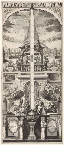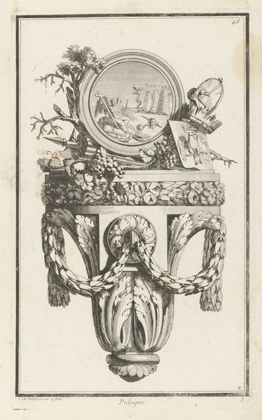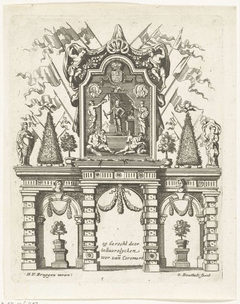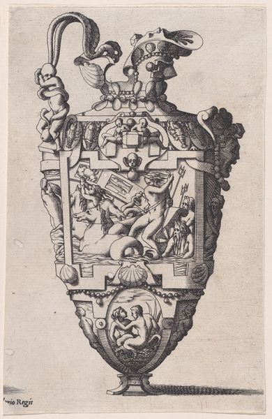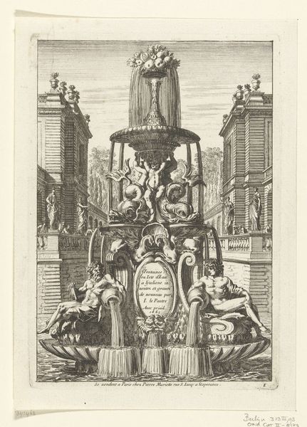 Editor: This engraving, "Pomp met een mascaron," made between 1560 and 1598 by Wendel Dietterlin, presents an elaborate fountain scene. There's something slightly unsettling about the precision of the lines mixed with the crumbling architecture surrounding the fountain. How do you interpret this work, especially given its historical context? Curator: It's crucial to view this engraving within the framework of Mannerism, a period characterized by artificiality and exaggeration. Dietterlin isn't merely depicting a fountain; he's engaging with power, status, and the role of the artist within a society steeped in inequalities. Note the figures attending to the fountain: their labor is rendered in meticulous detail. Consider how the print flattens or even fetishizes the social hierarchy. In whose perspective are we seeing this idealized landscape? Editor: So, the architectural precision contrasts with the implied social stratification. That makes the somewhat eerie feeling make sense. Curator: Precisely. The fountain itself, adorned with a grotesque mascaron, becomes a symbol of opulent display enabled by the labor of others. Does it also resonate with discussions about ecological justice, and who gets to benefit from the earth's resources? Consider this through a lens of colonial history and exploitation, concepts deeply embedded in art and society during Dietterlin’s era. Editor: It's eye-opening to see how even a seemingly simple image of a fountain can be a loaded commentary on social power structures of the time. I hadn't thought about the figures performing labor. Curator: Absolutely. The image pushes us to confront uncomfortable questions about our present and consider whose stories are validated or marginalized in the visual narratives we consume today. Editor: I will definitely remember to dig a little deeper. Thank you!