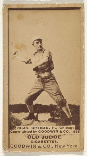 Editor: So, this is "Sprague, Pitcher, Chicago," a baseball card from 1888, part of the Old Judge Cigarettes series by Goodwin & Company. It's currently at the Met. I find the sepia tone so evocative of the era, almost ghostly. What jumps out at you when you look at it? Curator: Ghostly, yes! It’s like stepping into a forgotten ballpark. For me, it's the contrast. He's a sturdy figure, posed mid-pitch, yet presented on a fragile, ephemeral card meant to be discarded with cigarette packs. Do you think about how the ephemera of the every day, like baseball cards tucked into cigarette packs, become a way we connect with the past, telling us as much as, or more than, any grand history book might? It whispers secrets of daily life, what people valued, like, say, a baseball pitcher’s skill. Editor: That's such a lovely way to put it. A whisper of the past! Now, thinking about daily life back then... cigarettes and baseball seem like such different worlds, yet here they are, linked. Did the baseball players even know their faces were peddling tobacco? Curator: A curious question! Probably they were just excited to be recognized, like our modern influencers hoping for likes. But maybe some knew and didn't care; endorsements are endorsements. Think about how this small picture could become a measure of worth, a way to turn a ballplayer into an icon, for a fleeting moment at least. Almost like catching dreams. Editor: It really is more complex than just a baseball card. Thank you for that context! Curator: And thank you, you made me look at it anew.