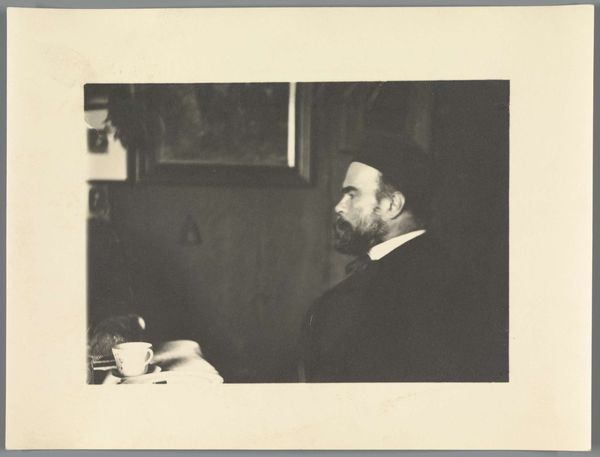 Editor: Here we have a gelatin-silver print from sometime between 1860 and 1915, entitled "Reproductie naar een foto van Willem Witsen," currently housed at the Rijksmuseum. It's a rather somber portrait, all cool grays and blacks. There is an air of quiet introspection about the sitter. What visual echoes do you perceive in this work? Curator: That somber mood you noted is key. Look at the light and shadow – the face emerges from darkness. This harks back to the *memento mori* tradition in portraiture, reminding us of mortality. Even the downward gaze contributes to this sense of gravity. Do you see how it might tap into anxieties common at the time? Editor: Well, industrialization was in full swing, so I imagine traditional social structures were changing. It’s interesting that you see *memento mori* here. I initially just thought of Romanticism and its focus on emotions and individual expression. Curator: Exactly! And consider the beard. Facial hair, particularly then, signified a conscious decision, projecting an identity, a type of cultural memory that speaks of tradition but also perhaps rebellion against emerging norms. Notice how the sitter chose to present himself, with great consideration to symbolism. This image almost presents him as an icon. Editor: So, the artist consciously utilizes symbols of the past while also expressing his individuality? It almost feels like a push and pull between tradition and modernity. Curator: Precisely! It’s a powerful tension, and understanding the symbolism provides a richer, more layered interpretation. Editor: I hadn't considered it from that perspective before, viewing the work as almost an internal psychological exploration expressed outwardly through visual symbols. Curator: These images offer so much when we learn how to decode them, providing windows into the cultural anxieties and affirmations of their time.