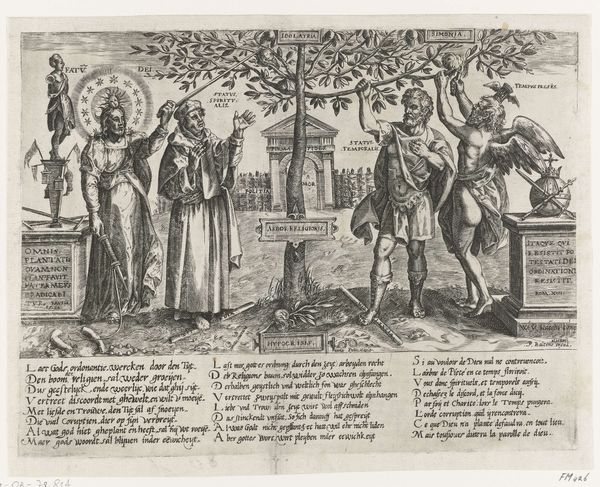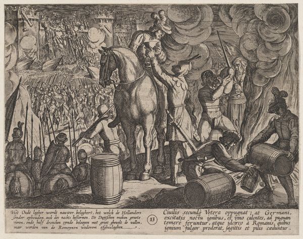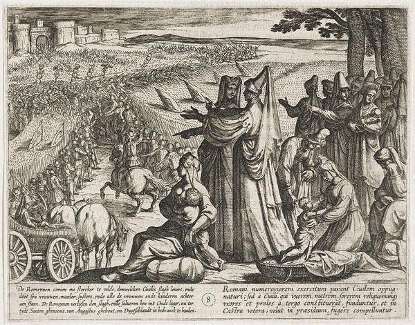 Curator: This engraving, dating from around 1611-1612, is titled "Plate 8: Women and Children Observe Civilis Battling the Romans," and it's part of Antonio Tempesta’s series "The War of the Romans Against the Batavians." The print is currently held at the Metropolitan Museum of Art. Editor: It has a very theatrical feel, doesn't it? The figures in the foreground are arranged almost like actors on a stage, with the battle raging behind them. The density of line work is striking, particularly in the background which adds to the chaotic feeling. Curator: Indeed, Tempesta utilizes that Baroque energy masterfully. It captures a pivotal historical moment but infuses it with drama that would have resonated with viewers familiar with similar depictions in history paintings, showing a complex play between observing, or perhaps more appropriately, mediating the scene from a seemingly safe space in the foreground. Editor: Absolutely. And I think the choice of engraving is important here. The medium allows for this incredible detail, really showcasing the artistry of the printmaking process and inviting a closer look at the texture of the lines, even simulating tones. You can practically feel the weight of worry etched into the faces of these women. Curator: It's also a commentary on the role of women in wartime. Though absent from the battlefield itself, they are portrayed as the keepers of memory, the bearers of future generations. They watch and wait and mediate what's actually happening on the ground. Editor: Exactly! Look at how their garments are rendered – with such detailed attention! And how different clothing and head coverings denote diverse familial roles. These are real material markers, underscoring that clothing isn’t just fabric but communicates something about personhood. Curator: I also think it's interesting to consider the historical context in which this print was made. The Dutch Revolt was still fresh in people's minds, and the story of the Batavians resisting Roman rule likely served as a powerful allegory for their own struggle for independence. This wasn’t just art; it was propaganda. Editor: Good point. So, on one hand, we’re examining the labor, artistry, and printing process. On the other, it makes one ponder the consumption of this kind of war imagery, and what kind of labor was necessary to make it palatable—if that’s even possible? Curator: Seeing it now really clarifies how art can act as both historical record and a highly charged statement about the politics of power. Editor: It underscores how a print, crafted from metal and ink, can become this enduring vehicle for historical narratives. It certainly leaves me thinking about art and conflict.