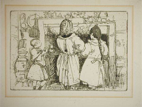Curator: What a beautifully observed slice of life. We're looking at "En Route," an etching by Jerome Myers. The artwork presents a genre painting depicting a woman with two children sitting indoors, likely in transit. The impressionistic style imbues the scene with a gentle, fleeting quality. Editor: My immediate reaction is one of understated elegance, wouldn’t you say? The muted colors and soft lines lend a melancholic feel. It’s not quite a formal portrait, but the composition is very well-structured and gives a subtle emphasis on the interplay of light and shadow to frame the group. Curator: Absolutely, and if we consider Myers’s engagement with social realism, the artwork captures a tender moment of marginalized urban dwellers, specifically women and children. It reflects the increasing presence and agency of women within the city’s social fabric. The composition directs us to interpret ideas related to family, immigration, and working-class communities during an era of vast societal shifts. Editor: Indeed, and focusing on the print medium itself, the etching lines vary beautifully, building layers of tonal complexity to articulate different forms—the billowing fabric of the woman's dress, the children's postures, the suggestion of a window in the background. Each line has purpose, it evokes textures even in such a restricted palette. The eye isn't just invited, but compelled, to move around this pictorial space. Curator: That's right. This seemingly ordinary subject matter resonates with many social narratives. The "en route" concept itself becomes symbolic of broader journeys undertaken by people, both in a physical sense and metaphorical aspirations for something better in an era of social inequality and immigration. Editor: In the end, I find it’s the successful orchestration of formal elements—line, tone, composition—that creates that sense of 'being' that anchors our engagement, whether one is focused on society, people, or politics. Myers wields these elements into an intimate, affecting composition. Curator: And it's this tension between the aesthetic execution and the layered meanings within, that makes “En Route” such a rich reflection of human experience in its historical time and continues to resonate profoundly with our contemporary societal questions and sensibilities today.