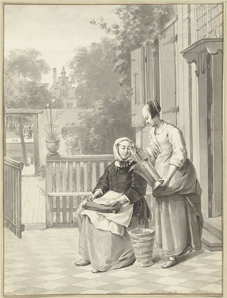 Editor: So, this is "Rain," an engraving by the Brothers Dalziel after Frederick Walker. It's quite small, and the detail is amazing. It feels so quiet and domestic, but with a sort of longing too. What strikes you about it? Curator: It's funny, isn't it? The everyday, elevated to art. I see a story, a moment suspended. Look at how Walker uses light and shadow. Does it remind you of anyone? Perhaps the Pre-Raphaelites? Editor: Yes, I can see that, the almost photographic realism. What do you make of the figures at the door? They seem almost ghost-like. Curator: Exactly! They are there, but also not quite. It's like a memory, faded yet vivid. Maybe Walker is suggesting that even mundane moments can hold a certain beauty, a certain significance in the passage of time. Editor: I like that idea of finding beauty in the mundane, it makes me appreciate it more. Curator: Me too. It's a reminder that life, even on a rainy day, is worth noticing.