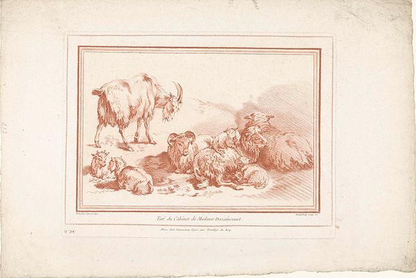 Editor: We're looking at "Schapen," which translates to "Sheep" from the period 1732-1776, an engraving by Gilles Demarteau. The print is quite simple, and has a rustic quality, but also possesses a kind of serene stillness. What initially catches your eye? Curator: Funny you should mention stillness. I find that I immediately notice how cleverly Demarteau's captured that sense of pastoral peace. It is very much of the moment – that almost absurdly idyllic view of nature embraced by the Rococo period, just before revolutionary tumult. Look how lightly he suggests the landscape around them, everything a wispy breath! Are they even really grazing, or just posing? Editor: Posing! I see what you mean! Almost like a carefully arranged tableau… Do you think this image says anything specific about the time period, then? Beyond just being "pretty"? Curator: Absolutely. This almost saccharine view of the rural hides a lot, you know. Engravings like these were incredibly popular among the upper classes. It wasn't just about admiring sheep; it was about projecting an image of harmony and plenty onto the countryside, a kind of aristocratic fantasy! A simplified and romanticized view of rural life that often didn't reflect reality. And Demarteau, as a skilled engraver, understood his market. Editor: So, it's like a carefully crafted form of propaganda almost? Disguised as something harmless and bucolic? Curator: Propaganda might be too strong a word, but certainly a curated narrative. Art often reflects not just what is, but what people want to believe *is*. It certainly makes you wonder about our own contemporary "picturesque" images and the messages *they* conceal. Editor: This has really reshaped how I see the image. Thanks for shining a light on that context! Curator: My pleasure! It’s a wonderful reminder that even the simplest of scenes can hold hidden depths.