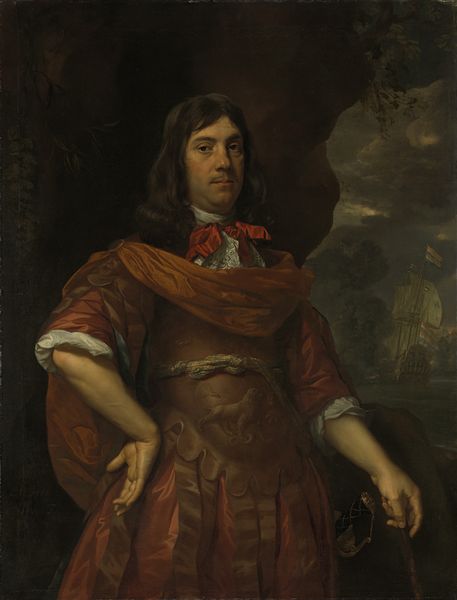 Editor: This is a captivating "Portrait of a Captain" painted in 1668 by Nicolaas Wieringa, using oil paints. I'm struck by how he's holding that instrument, and how confident he seems. What do you see in this piece? Curator: That instrument, a pair of dividers, isn't merely a tool; it's a potent symbol. In art of this era, dividers often represented navigation, mathematical precision, and even intellectual prowess. Given his profession, do you think there could be more to it? Editor: Perhaps! It suggests he's not just a soldier, but someone engaged in strategy, maybe even cartography. Curator: Exactly! And consider the slight atmospheric perspective in the background, suggestive of voyages or campaigns in distant lands. The way Wieringa renders the light on the Captain's face and attire adds layers of complexity too. The soft, almost melancholic gaze juxtaposes sharply against his rich apparel, wouldn't you agree? What does it evoke for you? Editor: That's so interesting. It's like he's simultaneously projecting power, but hinting at a vulnerability beneath the surface. Is that common in portraits like these? Curator: Certainly. Baroque portraiture often aimed to capture the psychological depth of the subject, their station, and inner world. Artists often did that through a carefully orchestrated selection of allegorical props that carry multiple symbolic significations. By portraying him this way, Wieringa transcends mere physical depiction, wouldn’t you say? Editor: I definitely see it now! Thanks, I’ll keep an eye out for such symbol-laden compositions in other portraits, too! Curator: A pleasure! And remember, these symbols resonated differently through time and culture. Each image is an intersection of personal and collective memory.