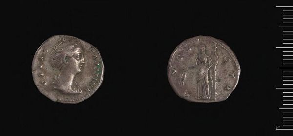 Editor: Here we have a Denarius of Faustina II from the Harvard Art Museums. It's small, silver, worn smooth by time. It feels like holding history itself. What do you see in a humble coin like this? Curator: I see power, actually. Faustina wasn't just a pretty face on a coin, but the wife of an emperor, capable of wielding influence. This coin, though small, was a statement, a tool to broadcast her image and solidify her power. It’s like a miniature billboard, projecting authority. Editor: So, it's propaganda, in a way? Curator: Precisely! And isn’t it fascinating how even everyday objects can be vessels of political messaging? It makes me wonder what our own coins will say about us centuries from now. Editor: Absolutely. It's like a tangible message across time. Thanks!