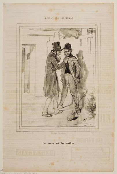 Editor: Here we have Paul Gavarni's "How do you do? -Thank you! and you? -I thank you. Don't take your hat off! -As you see; and ... are you well?..., p. 13," and it depicts two gentlemen exchanging greetings. The scratchy lines create a sense of hurried politeness, don't you think? What do you see in this piece? Curator: I see Gavarni playfully capturing the rigid social rituals of his time, like a dance where the steps are more important than genuine feeling. Do you notice how their bodies seem almost to recoil from each other, even as they engage in conversation? Editor: Yes, there's a sort of stiffness. Is that a commentary, perhaps, on the superficiality of those interactions? Curator: Precisely! Gavarni was a master of social satire. He uses humor to expose the artificiality beneath the surface of polite society. I wonder, does it remind you of any interactions you've observed lately? Editor: It does, actually. It seems some things never change. I'll definitely look at Gavarni's work with a different eye now. Curator: Exactly! Art can become a fun mirror to the world.