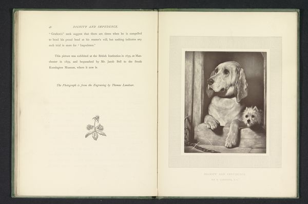 This is a photographic reproduction by Alexandre, made around 1900, of a painting by Joseph Stevens of a seated dog. During the 19th century, the rising middle class embraced domesticity, with pets, particularly dogs, becoming symbols of loyalty and status. Stevens, who came from a family of artists, often depicted animals with a sensitivity that mirrored human emotions, embedding societal values into his work. The dog in the painting is portrayed with a calm, almost melancholic expression. Alexandre's photograph captures the texture and tone of Steven’s original brushstrokes, and invites consideration of how the original painting becomes recontextualized through the lens of photography. The photographic reproduction extends the painting's reach, making it accessible to a broader audience, and reflects the era's fascination with capturing and disseminating images. This image invites us to reflect on how we project our own emotions and narratives onto animals, and how these representations mirror our societal values.