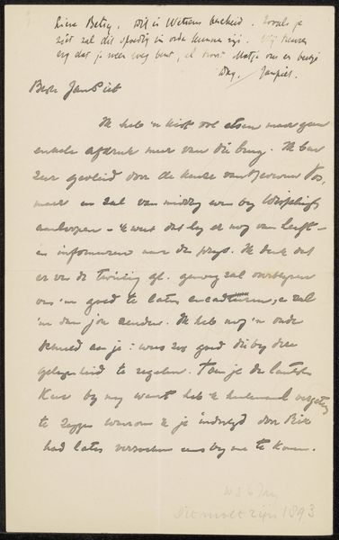 Editor: This is “Brief aan Jan Veth,” possibly from 1901, a drawing in ink on paper by Karel Johan Lodewijk Alberdingk Thijm. It's essentially a handwritten letter. The script gives it a really personal feel, almost like peering into the writer's thoughts. What stands out to you? Curator: Well, at first glance, I see an intimate artifact, a preserved moment of thought and communication. But looking deeper, I am drawn to the symbolism of the letter itself. What does it mean to hold someone's words in this way, handwritten and imbued with their physical presence? Letters used to be primary conduits for ideas and emotions across distances. How do we, today, see these forms of physical correspondence, considering how instantly we connect via digital forms? Editor: That’s a good point; it's easy to forget the significance of a handwritten letter now that we have email and texts. The care and time that went into it meant something more. Curator: Precisely! The penmanship becomes a kind of personal emblem, the flourishes and imperfections reflecting the writer’s character. And the content - undoubtedly personal - is now presented as a visual object. Consider, then, what cultural memory is preserved in this exchange? It’s not just the information conveyed, but the essence of human connection in a particular time. Editor: So, beyond the actual words, the letter becomes a symbol of communication itself. It seems like, in preserving this letter, we're preserving a little piece of history. Curator: Exactly! And we can explore the emotional weight, too. Think of the anticipation on the receiver's end... Perhaps Thijm knew Veth would carefully scrutinize every word. Letters invite rereading and sustained thought. It prompts us to question how different forms shape our cognitive processing and relational dynamics. Editor: That really sheds light on the power of this piece, and its connection to a slower, more intentional form of communication. Thanks, I never would have considered that on my own! Curator: My pleasure! These layered significations add more to just seeing the work for its basic visual quality.