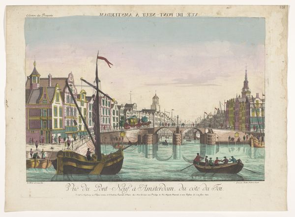 Curator: Here we have “Gezicht op de Nikolaifleet tegenover de Sankt Nikolaikirche te Hamburg,” an 18th-century artwork from the prolific workshop of Georg Balthasar Probst, currently housed at the Rijksmuseum. It's rendered with watercolor and colored pencil on a printed base. Editor: The colors are surprisingly bright, almost whimsical, like a page torn from a children's book. Yet there's also a compelling stillness; despite the activity, the scene feels suspended in time. Curator: Exactly. The meticulous detail hints at the Baroque sensibility, but there's also an emerging sense of the genre painting, capturing everyday life in a burgeoning urban center. Consider the figures populating the bridge – the dynamics between them and their relationships to space are deeply important to interpretation of class and labour. Editor: Those figures are interesting, indeed. Each one seems posed, almost theatrical. They add a performative layer to the scene. And the church spires in the distance... they puncture the otherwise very rigid architectural design with a sense of transcendence. Curator: The positioning of Sankt Nikolaikirche underscores its centrality to the lives of Hamburg's residents. It also prompts discussion of power structures, and religion’s impact on social constructs during this period, bearing in mind the complex web of religious and trade-related issues in 18th-century Hamburg. Editor: Right, there is definitely commentary on display that feels intertwined with my visual response. Even these pastel colors provide contrast; you see, the hard city architecture is softened and imbued with possibility. That contrast says much about people and their place within this budding capital. Curator: Precisely. And as the print is housed at the Rijksmuseum, it further creates dialogue between the cultural and socio-political. Editor: To me, it feels both distant and oddly intimate. I appreciate its almost storybook quaintness and deeply feel the emotional message imbued in the work. Curator: And understanding that message is key to fully appreciating Probst's work. Editor: A beautiful way to end our time with Probst.
