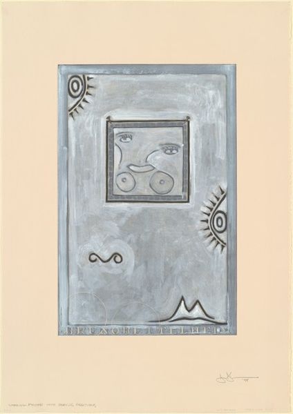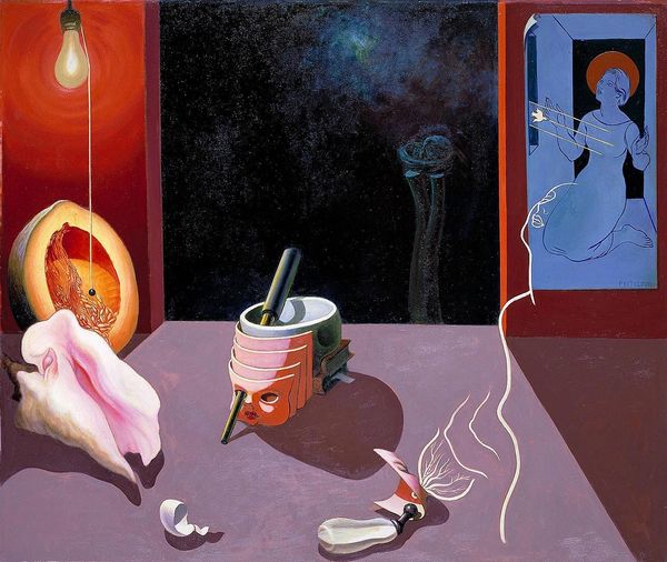 Editor: This intriguing oil painting is titled "Composition (H.1327)" by Francis Bott, date unknown. It has an almost theatrical quality, a stage filled with enigmatic objects. What do you see in this piece that might speak to its cultural context? Curator: I see a work deeply invested in the lineage of Surrealism and Metaphysical art, movements profoundly shaped by the socio-political anxieties following the World Wars. Notice the stark contrasts – the dreamlike sky juxtaposed with the rigid geometric forms. How might these oppositions reflect the artist’s engagement with the cultural moment? Editor: I hadn't thought of it that way, but now I see how the familiar objects rendered strange could mirror the disrupted sense of reality after such devastation. The fractured face in the painting within the painting, it feels like a broken identity. Curator: Precisely. The fractured face is compelling. Also, consider the museum-like setting itself. The art feels 'staged' or 'contained' even when it gestures towards other planes of existence or expression like landscapes or portraits. This deliberate staging reminds us that what is considered "art" is a constructed narrative, heavily influenced by institutional spaces and market forces. Do you think the inclusion of the sky reflects on the gallery space? Editor: Perhaps the sky acts as a commentary on what art seeks to represent but can only allude to, reminding viewers that they’re not looking at nature, but rather at artifice within the constraints of this gallery. The artist shows a bit of frustration or limitation of art to showcase truth. Curator: Indeed! It becomes a meta-commentary on art's role in mediating our understanding of reality and its inherent limitations. I appreciate you raising these questions with me. Editor: I leave with a new view of Metaphysical art as being a commentary on public image, a broken public image that alludes to much more, using visual contrast to showcase a point of view about art. Thanks for opening my eyes!