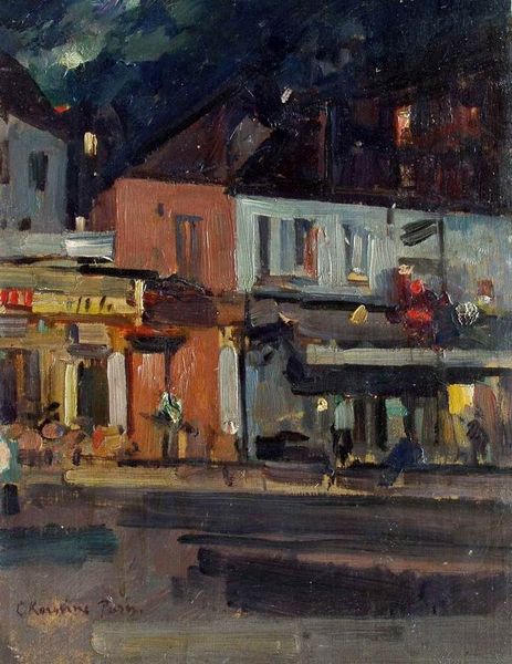 Curator: This is an oil on canvas painting called "Early Morning Storefront" by Dan Graziano. Note how the light hits the building, creating dynamic shadows that add depth to the composition. Editor: My first thought is a feeling of nostalgia—almost Hopper-esque, with a quiet sense of anticipation for the day to begin. Curator: Interesting observation! Looking at the artist's deliberate brushstrokes and use of a muted color palette, especially the oranges and grays, you could easily suggest he is aiming to depict the serenity of a cityscape. The geometric arrangement of the windows offers another compelling framework for interpreting urban space. Editor: Precisely. Those repetitive window patterns against the warm, worn brick also evoke a sense of memory and continuity. It reminds me of the old American flags hung above shops as an unofficial signifier of Main Street values. Curator: Focusing on that architectural layout, how do you interpret the function of the storefront and awning? Editor: Awnings serve as protective symbols; offering shelter and promise of business—think of that contrast with the unreadable text above it… something's missing, which adds to the enigma. It has been replaced and partially rubbed, or it's just covered with time. Curator: True. Notice how the artist masterfully handles value contrast. Look closely at the interplay between light and shadow in the depiction of objects that surround that awning to better appreciate its craftsmanship. Editor: And the placement of items for sale? How do those red and white columns speak? They draw us in through primal patterns. They almost say: Welcome, but observe the boundary! Curator: Well said! A very powerful interpretation regarding primal marketing tools that evoke emotions and feelings while creating identity… it’s fascinating to observe how our respective frameworks illuminate distinct layers. Editor: Agreed; there's something inherently powerful about combining structural artistic analysis and deep cultural associations that gives voice to these images!
