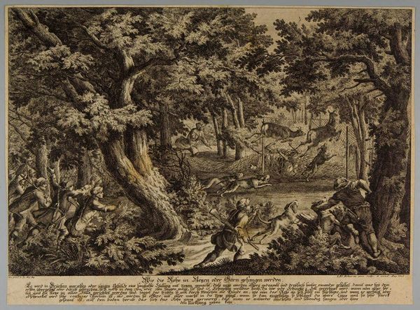 Curator: Adrian Zingg's rendering, entitled "A Forest, with Waterfall," presents a serene eighteenth-century landscape scene. Editor: The initial impression is one of studied tranquility, a carefully arranged composition of light and shadow. The gradations of tone are remarkable. Curator: Indeed. The picturesque aesthetic was becoming increasingly popular at the time, influencing how people perceived and depicted nature. Note the inclusion of figures almost as a method of defining the scale of the setting. Editor: And those figures are placed to guide the eye through the landscape. The waterfall serves as a focal point, anchoring the composition, while the figures offer secondary points of interest. Curator: The role of the artist became one of curating a pre-existing landscape, not simply capturing it, but molding it into an idealized scene, much like a stage set. Editor: I agree, there is a theatricality to this scene. Zingg really focused on texture and tonal values. Curator: It's interesting how art reflects the evolving relationship between humans and their environment. Editor: A beautiful observation that this image seems to encapsulate.